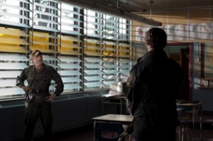 L-R: Inside one of the classrooms at JFK High School, Capt. Weaver (Will Patton) talks to Tom (Noah Wyle) about going to the armory