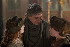 The Pope (Jeremy Irons) embraces both Giulia (Lotte Verbeek) and Vittoria (Jemma West) before they venture out on their peasant stroll