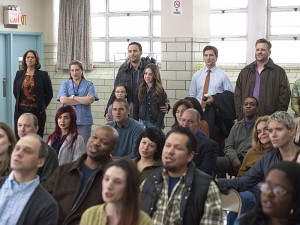 Anna Deavere Smith as Gloria Akalitus, Merritt Wever as Zoey, Mackenzie Aladjem as Fiona Peyton, Dominic Fumusa as Kevin, Ruby Jerins as Grace Peyton, Peter Facinelli as Dr. Cooper and Stephen Wallem as Thor in Nurse Jackie (Season 5, Episode 10). – Photo: David M. Russell/SHOWTIME – Photo ID: Nursejackie_510_0446.R
