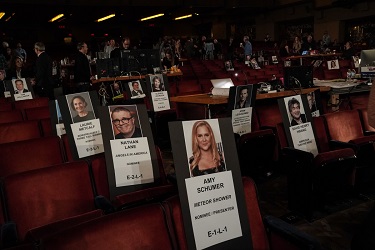 Laurie Metcalf, Nathan Lane, and Amy Schumer seat cards are seen at rehearsals for the THE 72nd ANNUAL TONY AWARDS broadcasting live from Radio City Music Hall in New York City on Sunday, June 10, 2018 (8:00-11:00 PM, live ET/delayed PT) on the CBS Television Network. Photo: John P. Filo/CBS ©2018 CBS Broadcasting, Inc. All Rights Reserved
