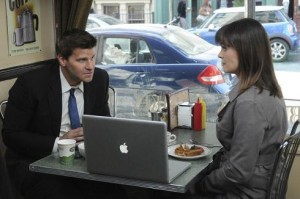Brennan (Emily Deschanel, R) and Booth (David Boreanaz, L)