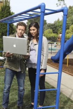 Hodgins (TJ Thyne, L) and Angela (Michaela Conlin) discover the source of the titanium found in the victim’s remains – the paint on the new monkey bars.