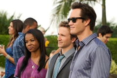 Carmen (Dana Davis), Franklin (Breckin Meyer) and Bash (Mark-Paul Gosselaar) watching the bikini-clad girls tossing a beach ball in the pool at Stirred's charity event