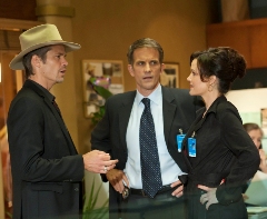 Carla Gugino as Asst. Director Goodall (standing, L), Erica Tazel as Rachel (seated, center), and Timothy Olyphant as Raylan (seated, R)