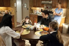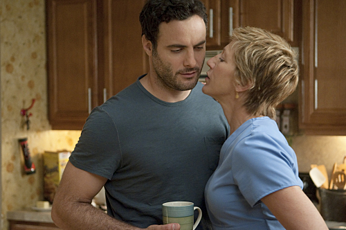 Jackie certainly seems to be working overtime playing the perfect wife, making pancakes and bacon for breakfast, packing chicken sandwiches for Kevin’s lunch. The dark comedy begins immediately as Jackie, drinking a cup of tea, tells Kevin she’s taking a break from coffee because it makes her “buzzy.” Quickly, with Kevin’s back turned, she pops a pain pill. Oh Jackie. Won’t you ever learn? It’s going to take a lot more than a nice breakfast to keep your marriage together, especially if you keep popping pills.