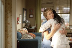 Jackie (Edie Falco) and Tunie (Jaimie Alexander) hug it out after Jackie agrees to let her stay for a few days.