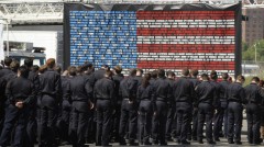 The new recruits standing at attention in front of the wall containing the names of the firefighters who perished on 9/11