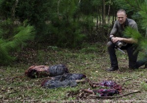 The message “Go back” greets Merle (Michael Rooker) and his team in one of the most creative ways I’ve ever seen body parts used. But then I think it has more to do with the theme of “Hounded” than simply being a message. Who needs to go back? And go back to what? The world will probably never return to what it once was. The zombiepocalyse is here to stay and let’s not forget, everyone who dies comes back zombified. So again I ask, go back to what?