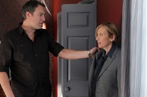 Max (John Corbett) pins Bryce (Toni Collette) to the wall after an altercation with Marshall.