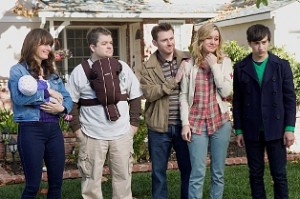 L-R: Charmaine (Rosemarie DeWitt), Neil (Patton Oswalt), Evan (Keir O'Donnell), Kate (Brie Larson) and Marshall (Keir Gilchrist) say goodbye to Tara and Max