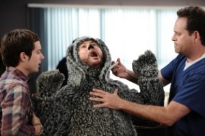 Wilfred (Jason Gann, C) goes bananas in the vet's office and a vet tech (Matt Kaminsky, R) sedates him while Ryan (Elijah Wood, L) watches
