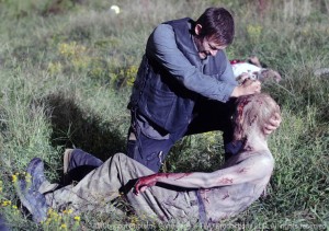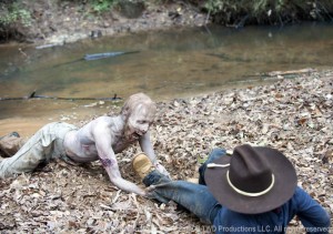 Have you ever noticed the lethargic way of the Walkers when there’s no sign of fresh meat around? This doesn’t truly catch my attention until Carl (Chandler Riggs) comes upon a Walker and watches it for a while. The undead is stuck in a bog and appears as if it’s sleeping standing up. This makes me curious about the makeup of Walkers because we still don’t know what caused the living to become these hideous undead creatures. They are reanimated by some virus or other unseen chemical reaction, and what recharges their undead button is human flesh. My question is why does flesh and blood excite their insatiable hunger? What fuels their undead fire? Oh, and how different are we from them when the decision to end a man’s life based on a bunch of what ifs is the only thing keeping us from being cold-blooded killers too?