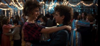 The school is hosting a winter dance called the “Snow Ball.” It’s so cute how all the kids get dressed up. Dustin steals the show with his new hair-do. And kudos to Steve for acting like a big brother and dropping Dustin off at the dance.