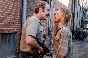 Simon (Steven Ogg) knows his little act of violence against Jadis’ (Pollyanna McIntosh) people will come back to bite him sooner or later. Perhaps he wants to recruit as many people as he can to be on his side so that when the shit hits the fan, he’ll have back up. Simon sells a good line of bullshit to Dwight (Austin Amelia) about what Negan (Jeffrey Dean Morgan) has put him through but in the end, what Simon really wants to do isn’t exactly how he explains it —“Move on.” But it’s not really moving on in the way Dwight thinks. Simon has no intention of leaving Rick (Andrew Lincoln) and his people alone…no. Simon is ready to do Hilltop what he did to the Scavengers. He’s tired of having his ass handed to him by Rick, Maggie (Lauren Cohan), and the others. Simon wants to cut them all down to size, which goes against everything Negan wants to do. Granted, Negan’s plan – using biological warfare with zombie guts – is disgusting and downright inhumane; at least he doesn’t want to wipe everyone out. Side note: the extremely up-close scenes where the camera pans in on the vile innards of the walkers being cut, ripped, and spilled out made me want to hurl. So gross.