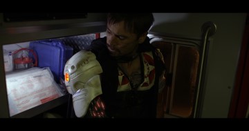 When trying to contact dispatch, they realize that their radio and cell phones aren’t working and they’re on their own. Once in the ambulance, Armstrong begins to exhibit strange behavior and becomes violent. Before they can get him out of the vehicle, a fanatically assassin violently attacks them. The soldier is hunting Armstrong and wants to kill anyone who comes in contact with him. Before he can finish off the EMTs, Armstrong saves them and defeats the soldier.